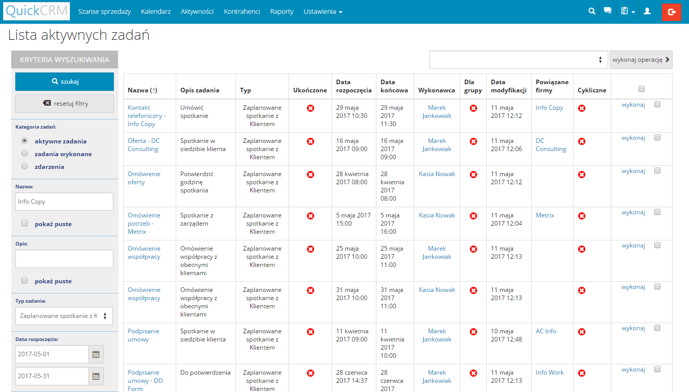 W naszym systemie CRM znajdziesz również listę aktywności. Za pomocą intuicyjnej wyszukiwarki możesz odnaleźć zadania i zdarzenia przypisane do konkretnej osoby lub wszystkich pracowników. Lista aktywności pozwala w szybki sposób zapoznać się ze wszystkimi zadaniami, które zrealizował dany pracownik oraz z pełnym ich opisem.