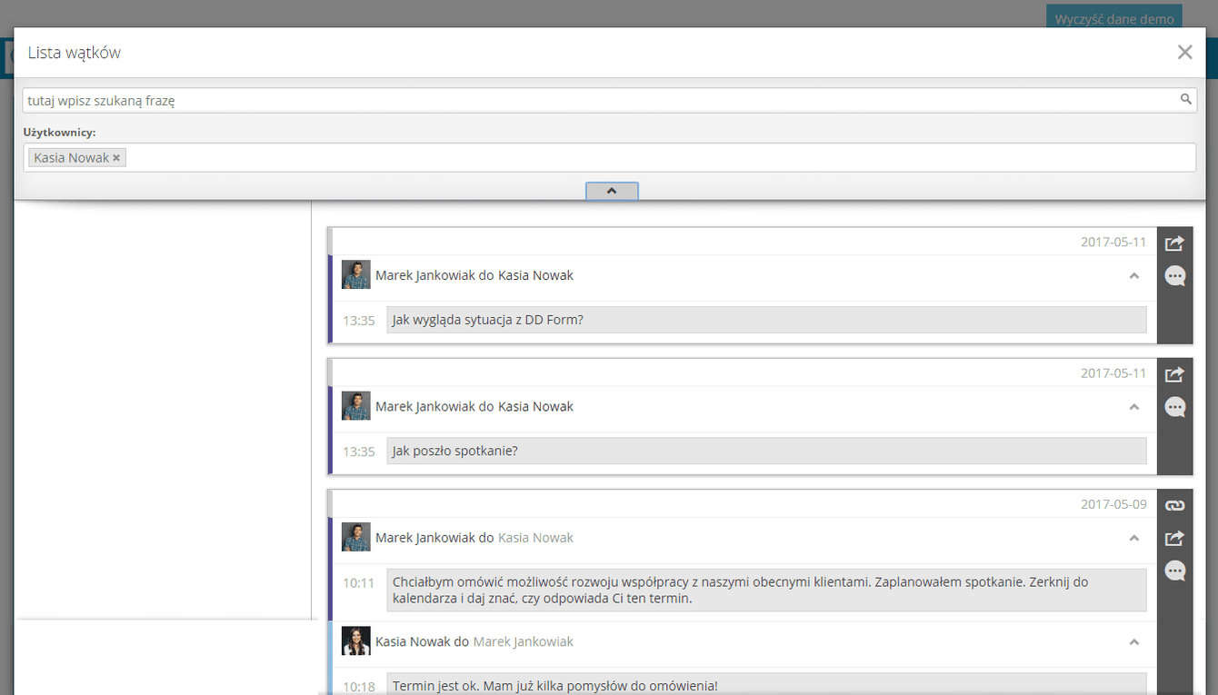 Prosty CRM pozwoli usprawnić wymianę informacji w Twoim zespole. Możesz wysyłać wiadomości do jednej lub wielu osób, a także załączać niezbędne pliki, np. oferty lub zdjęcia. Komunikator posiada wyszukiwarkę, dzięki której możesz szybko odnaleźć wszystkie wiadomości powiązane z daną osobą lub grupą. Nieważne jakie czynności w systemie właśnie wykonujesz. Nie musisz tracić cennego czasu na przełączanie się pomiędzy aplikacjami i przesyłanie wiadomości oraz plików w wielu miejscach.