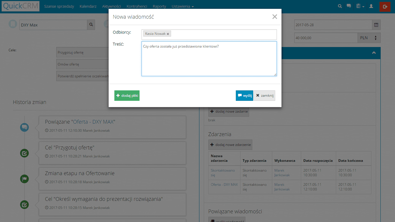Wiadomości możesz wysyłać z różnych miejsc systemu. Jeśli chcesz przekazać pracownikowi ważną informację dotyczącą np. szansy sprzedaży, możesz z jej poziomu wysłać wiadomość. W ten sposób wiadomość zostanie powiązana z szansą i będzie łatwo dostępna.