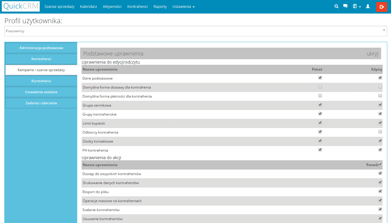 W QuickCRM to Ty decydujesz o tym, co widzą Twoi pracownicy. System nie narzuca odgórnie uprawnień dla pracowników. Możesz tworzyć profile np. pracownik, które będą miały określony poziom uprawnień. W ten sposób decydujesz o dostępie do poszczególnych informacji w systemie. Zadbasz także dzięki temu o bezpieczeństwo danych, którymi zarządzasz m.in. poprzez eliminację ryzyka przypadkowego usunięcia lub edycji danych.